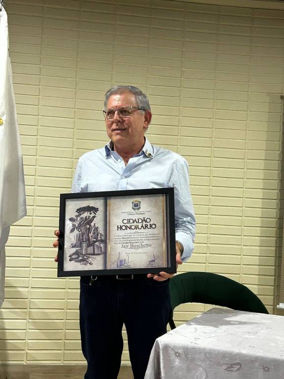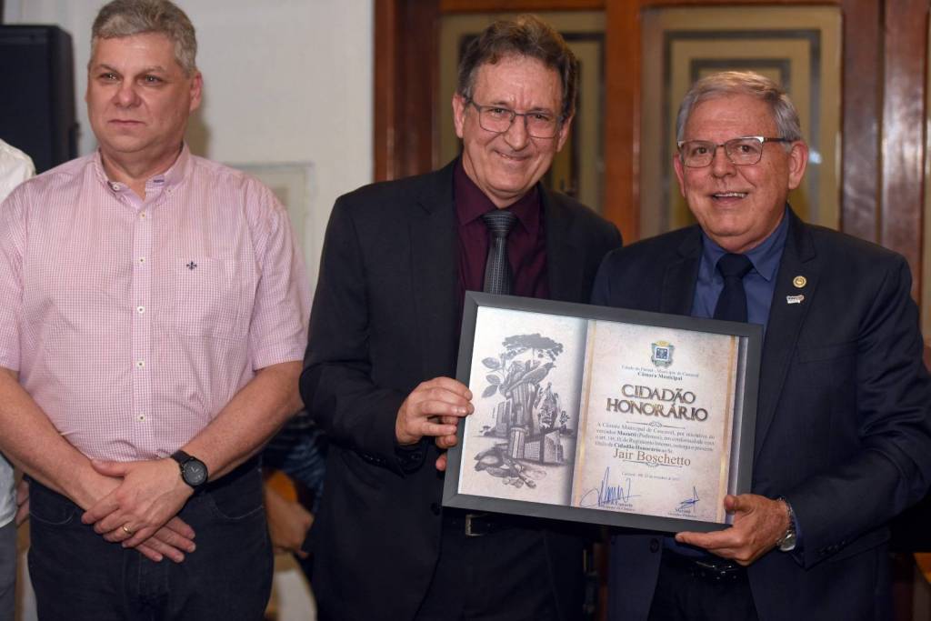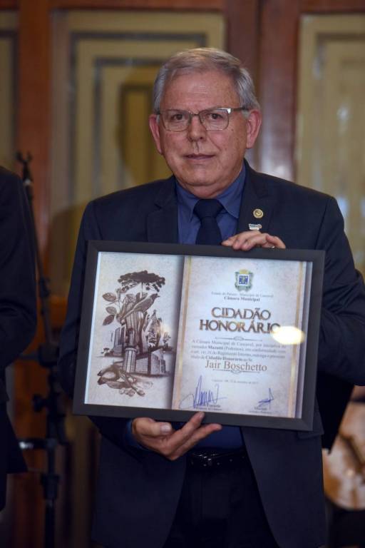 Após aprovação unânime na Câmara Municipal de Cascavel do Projeto de Decreto Legislativo de autoria do vereador e também contabilista Sidnei Mazutti, o Companheiro Jair Boschetto recebeu o TÍTULO DE CIDADÃO HONORÁRIO.