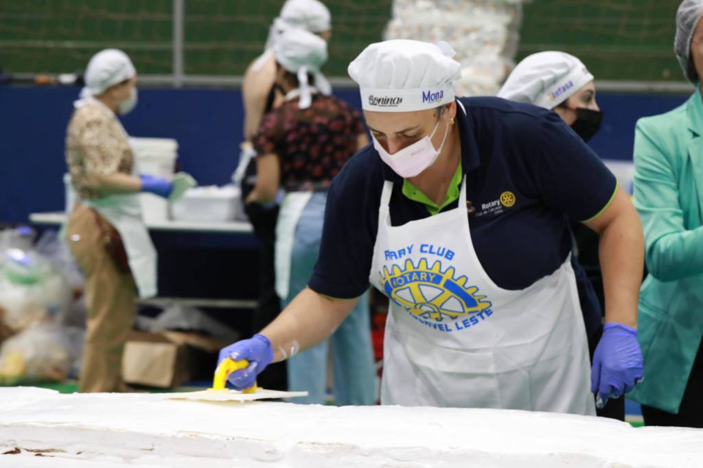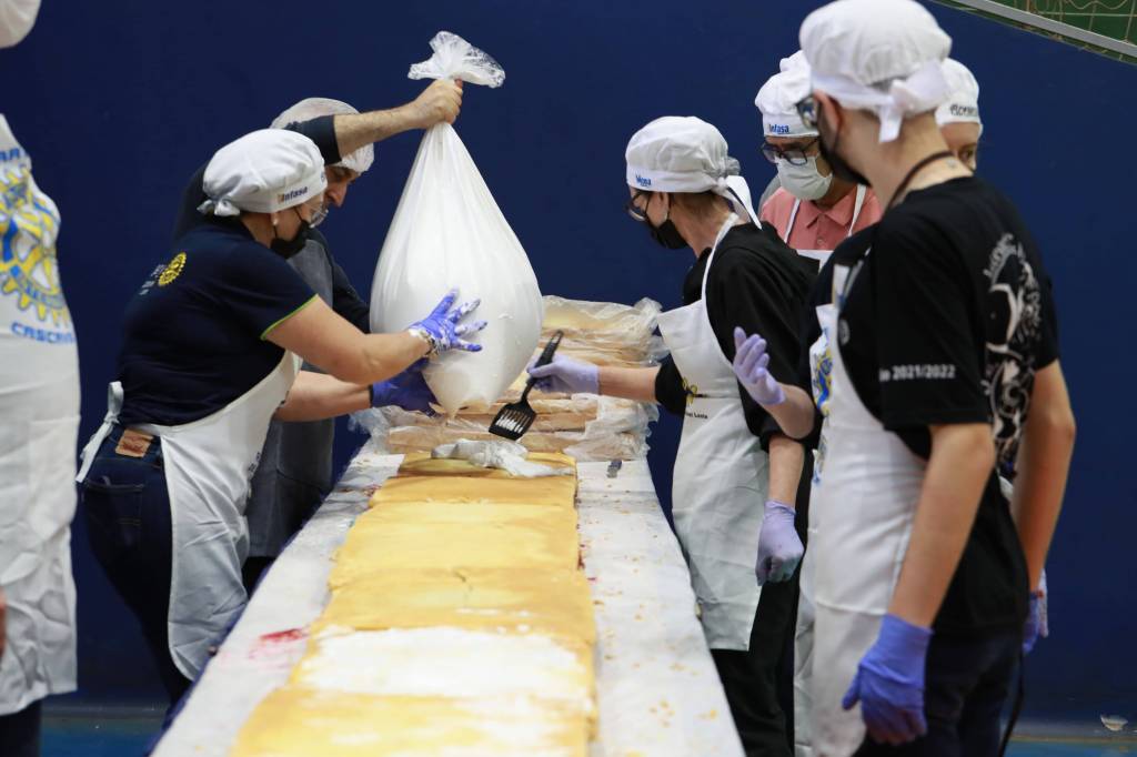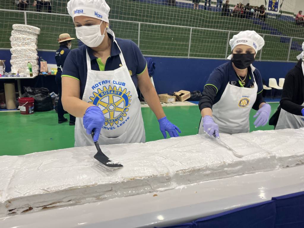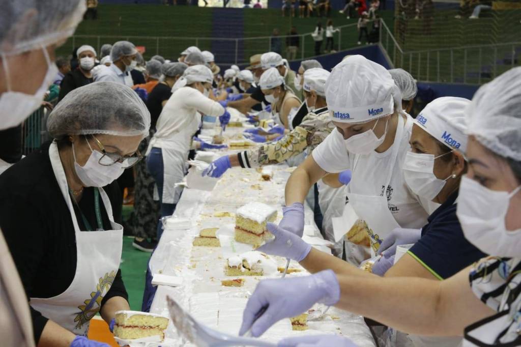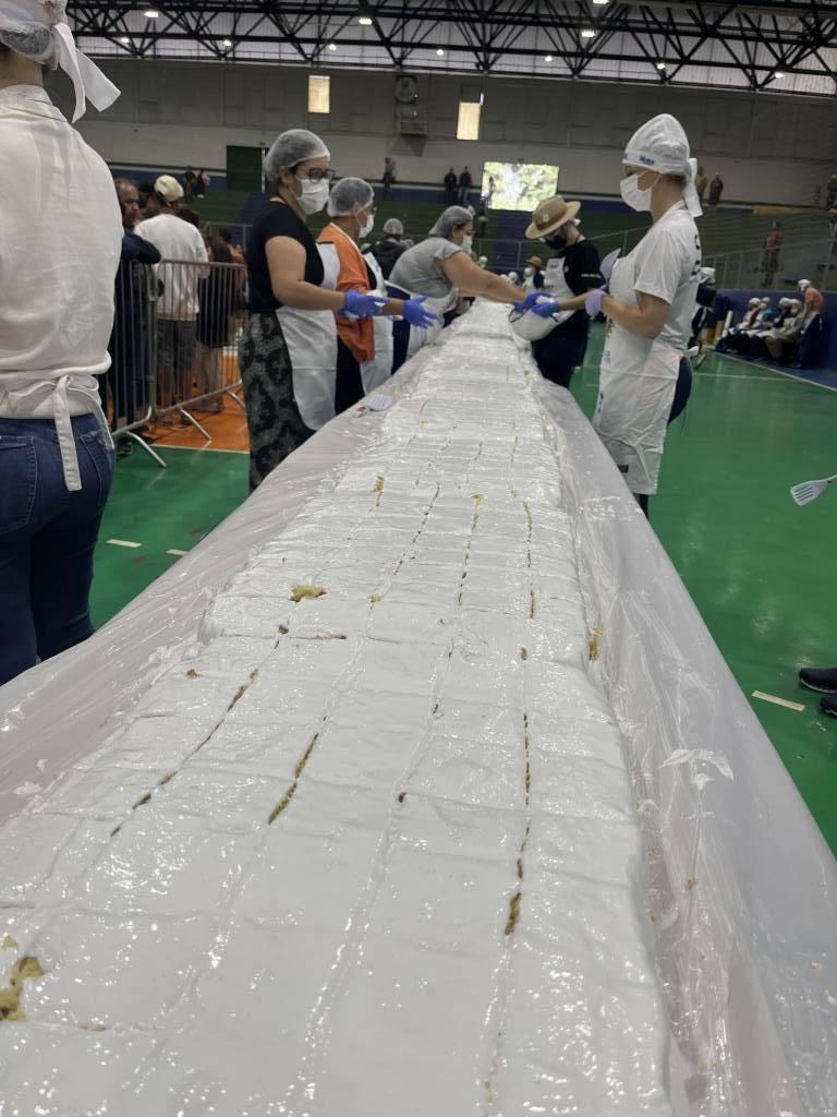 O bolo de 50 metros, com mais de 650 kg entre massa, recheio e cobertura, foi distribuído gratuitamente para a comunidade, que compareceu no evento para saborear essa delícia com recheio de doce de leite e morango.