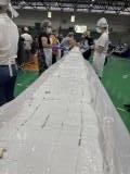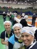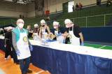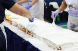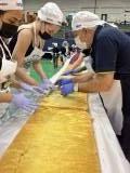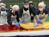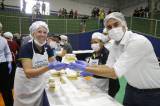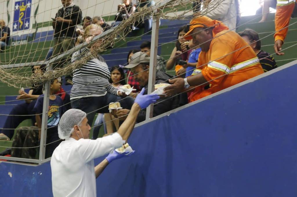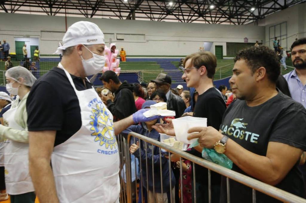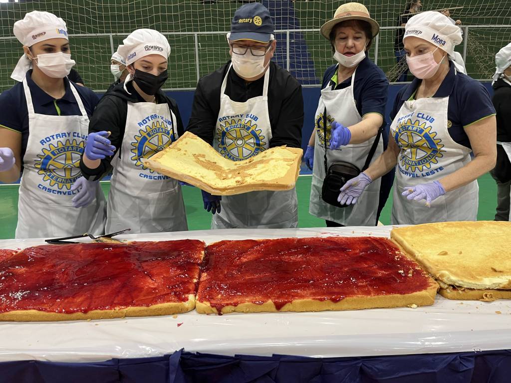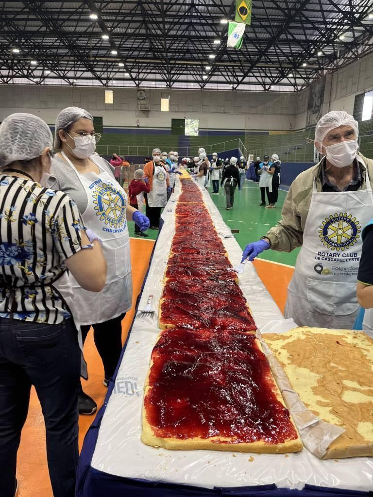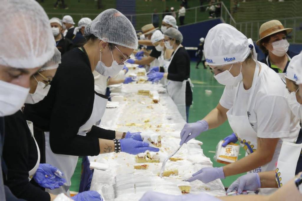 O bolo de 50 metros, com mais de 650 kg entre massa, recheio e cobertura, foi distribuído gratuitamente para a comunidade, que compareceu no evento para saborear essa delícia com recheio de doce de leite e morango.